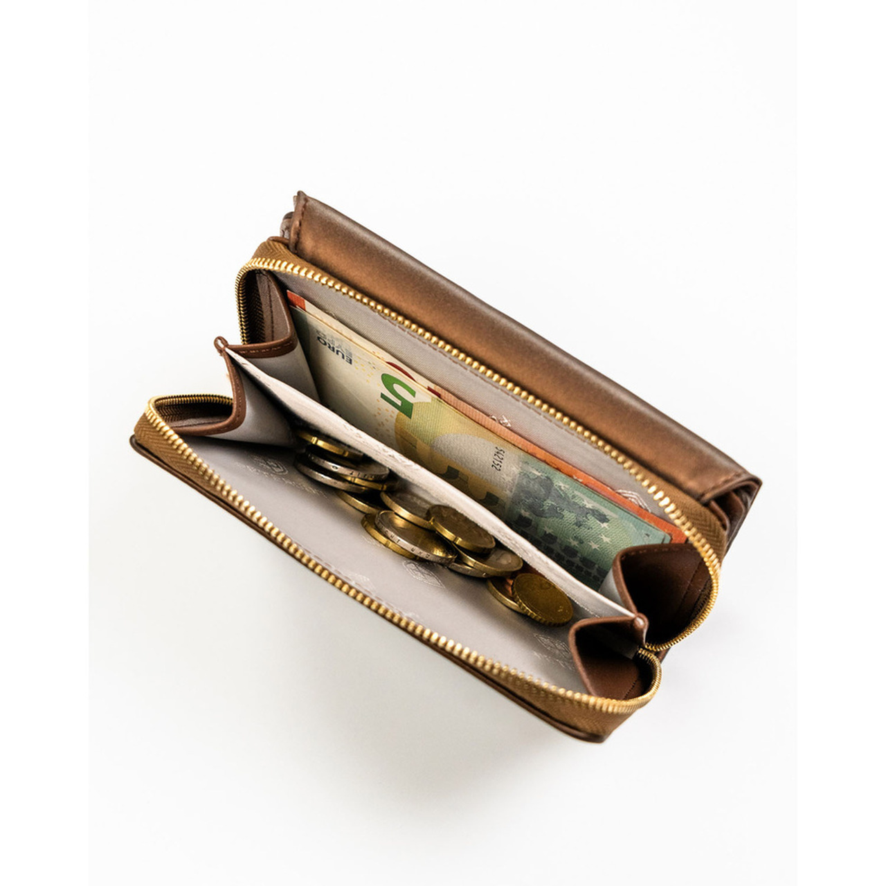 - Podwójna kieszeń na monety zamykana na suwak — bezpieczna, łatwo dostępna i pojemna.