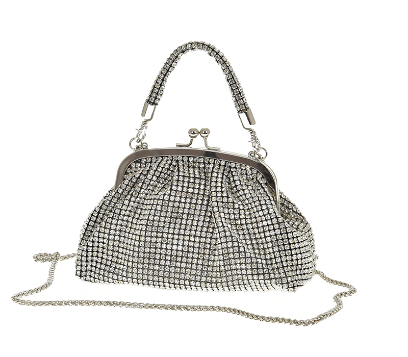 Torebka została wykonana z wysokiej jakości materiału syntetycznego, bogato zdobionego drobnymi elementami, które subtelnie się mienią.