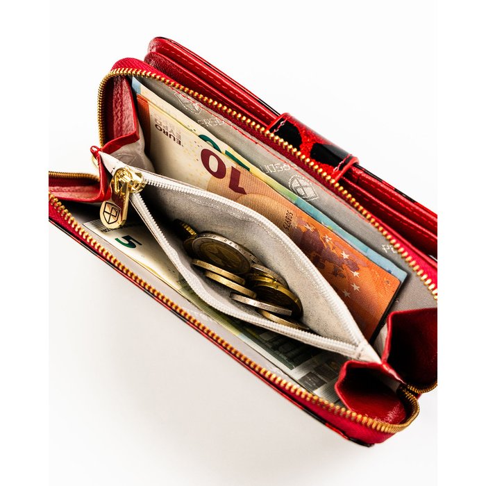 • Intensywny czerwony kolor sprawia, że portfel wyróżnia się w torebce i dodaje energii każdej stylizacji.