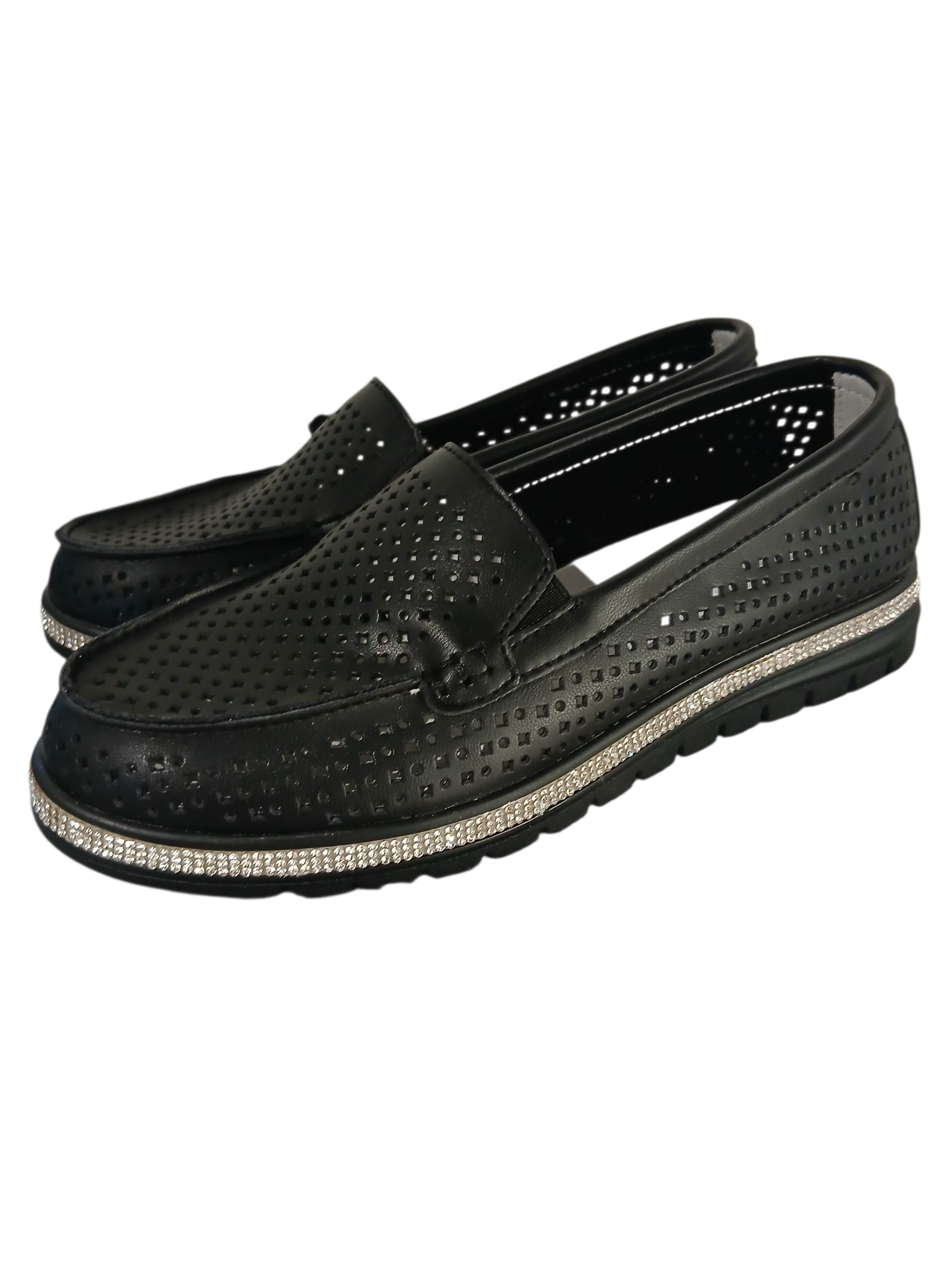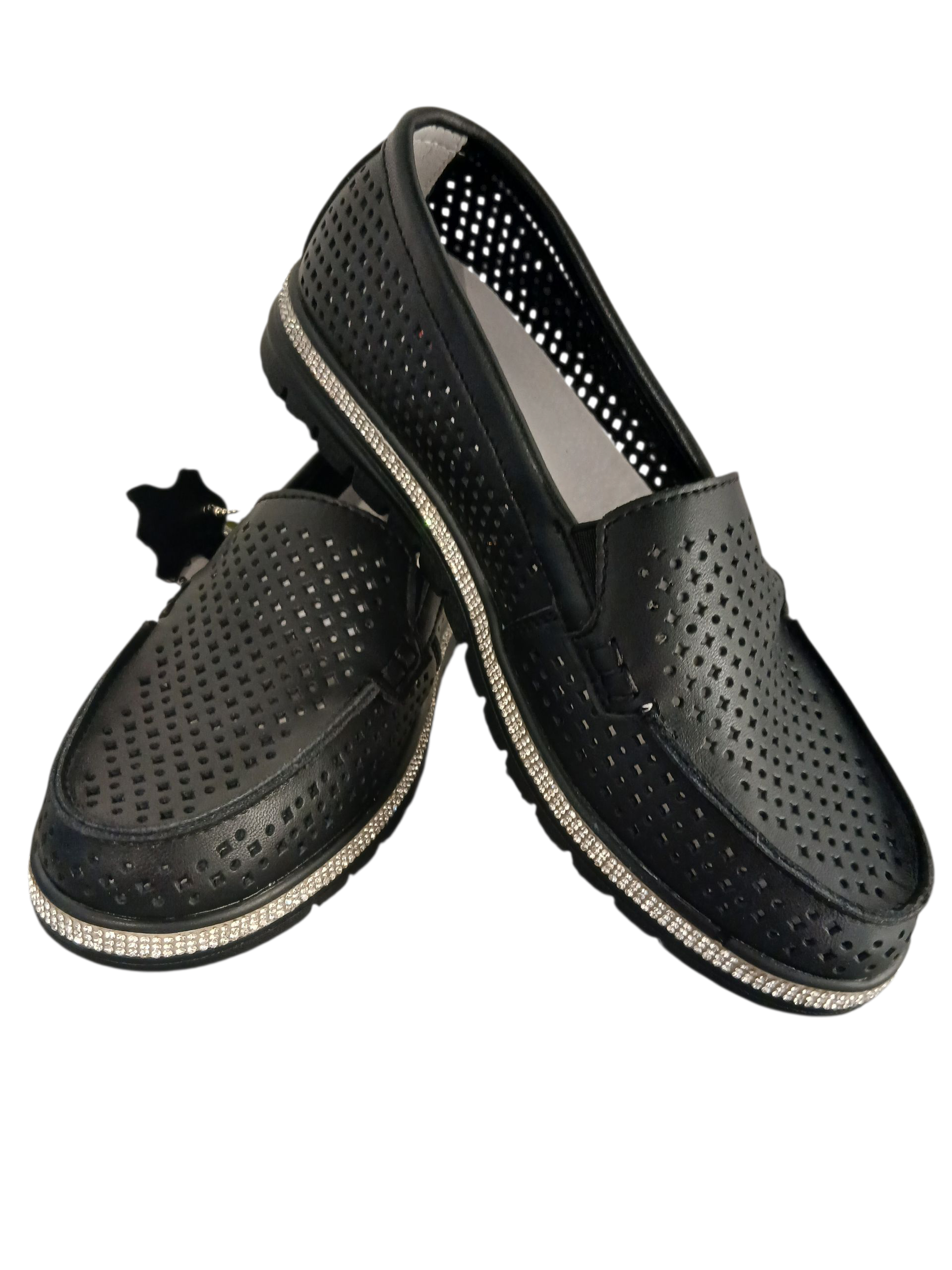 Santoria – Ażurowe czarne mokasyny damskie ze skórzaną cholewką i paskiem z cyrkoniami