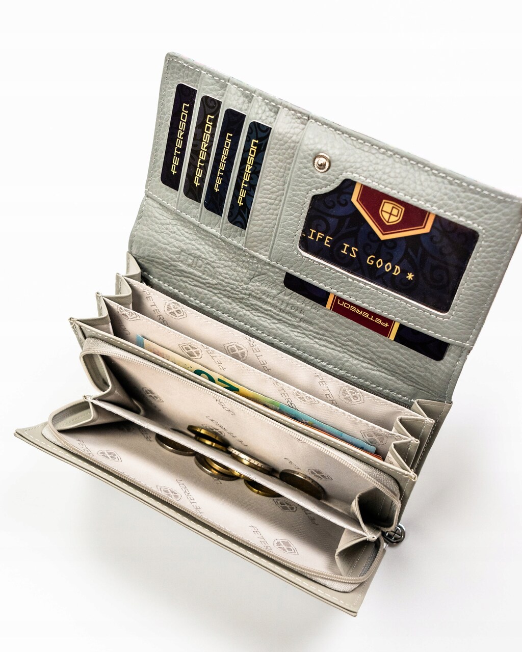 - Podwójna kieszeń na bilon na suwak – drobne są bezpieczne i nie wysypują się, a Ty masz do nich szybki dostęp.