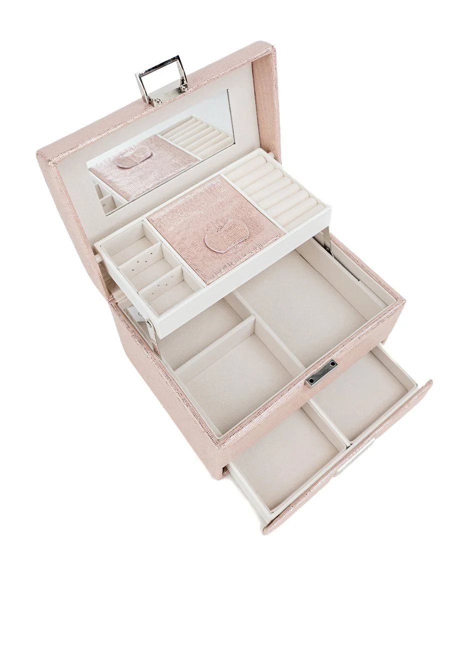 Wielofunkcyjne przegródki pozwalają uporządkować biżuterię, kosmetyki oraz drobne akcesoria, chroniąc je przed zarysowaniami i przemieszczaniem się. Wbudowane lusterko umożliwia szybkie poprawki makijażu lub wygodny dobór dodatków – zawsze wtedy, gdy tego potrzebujesz.