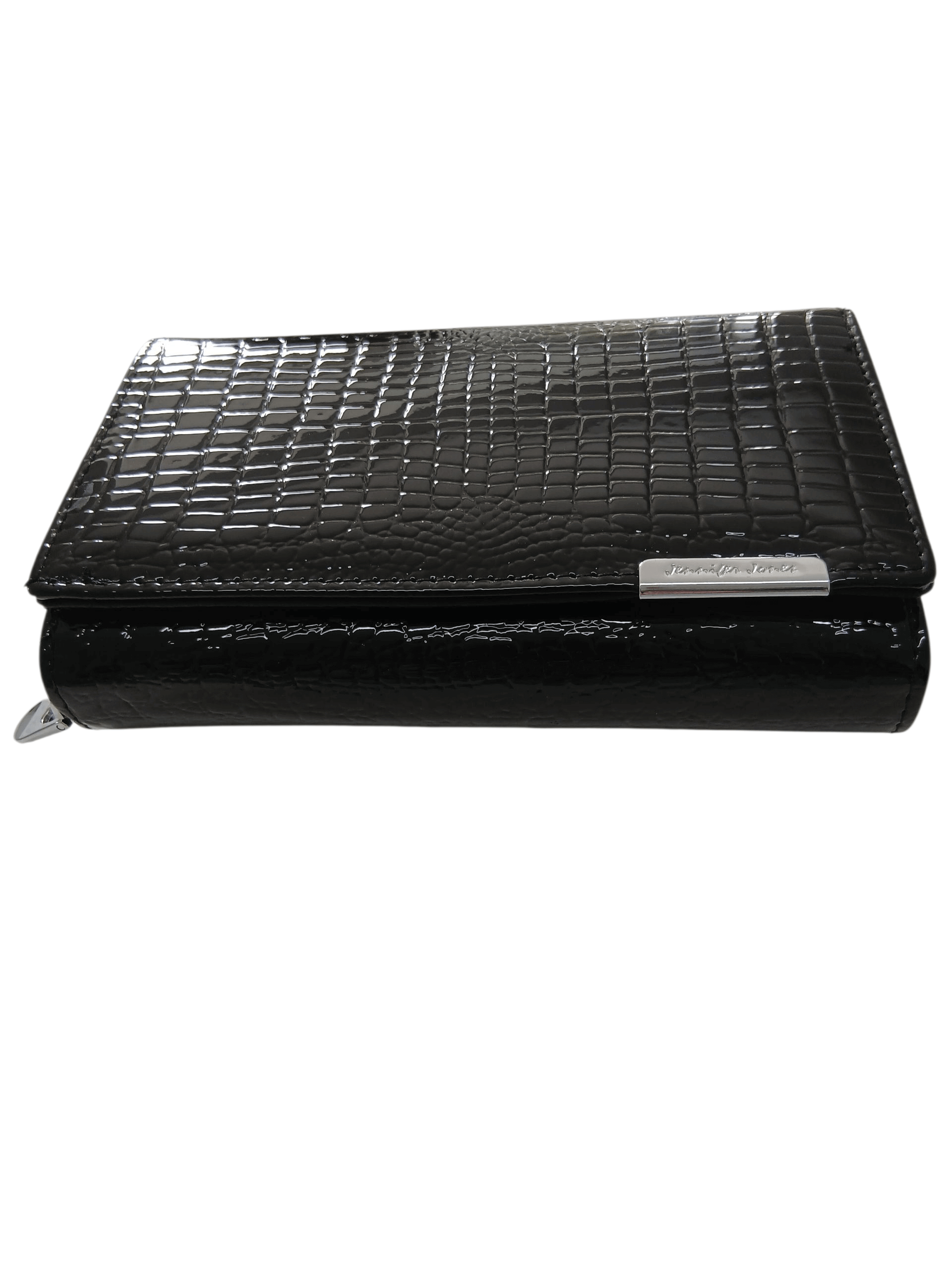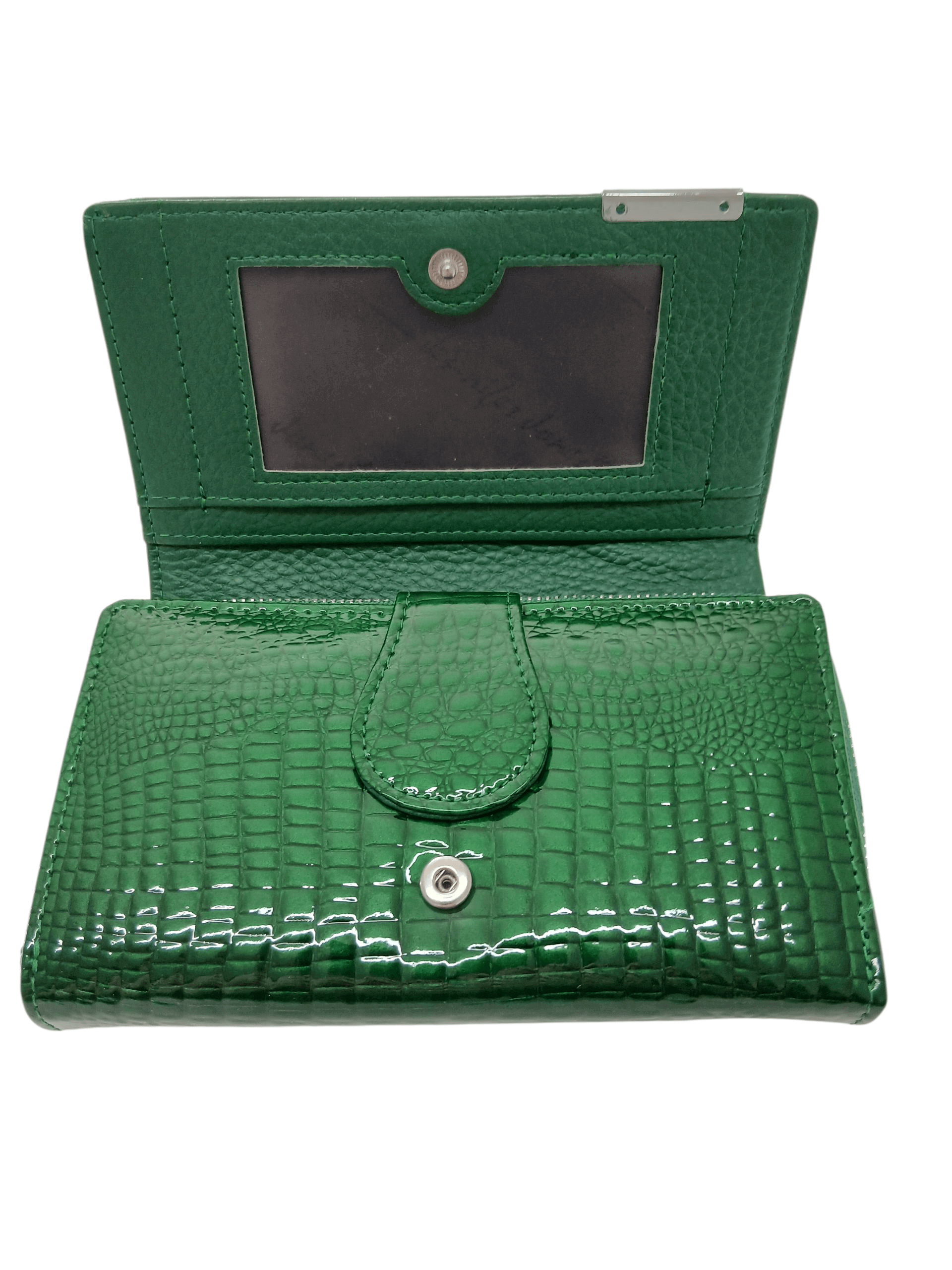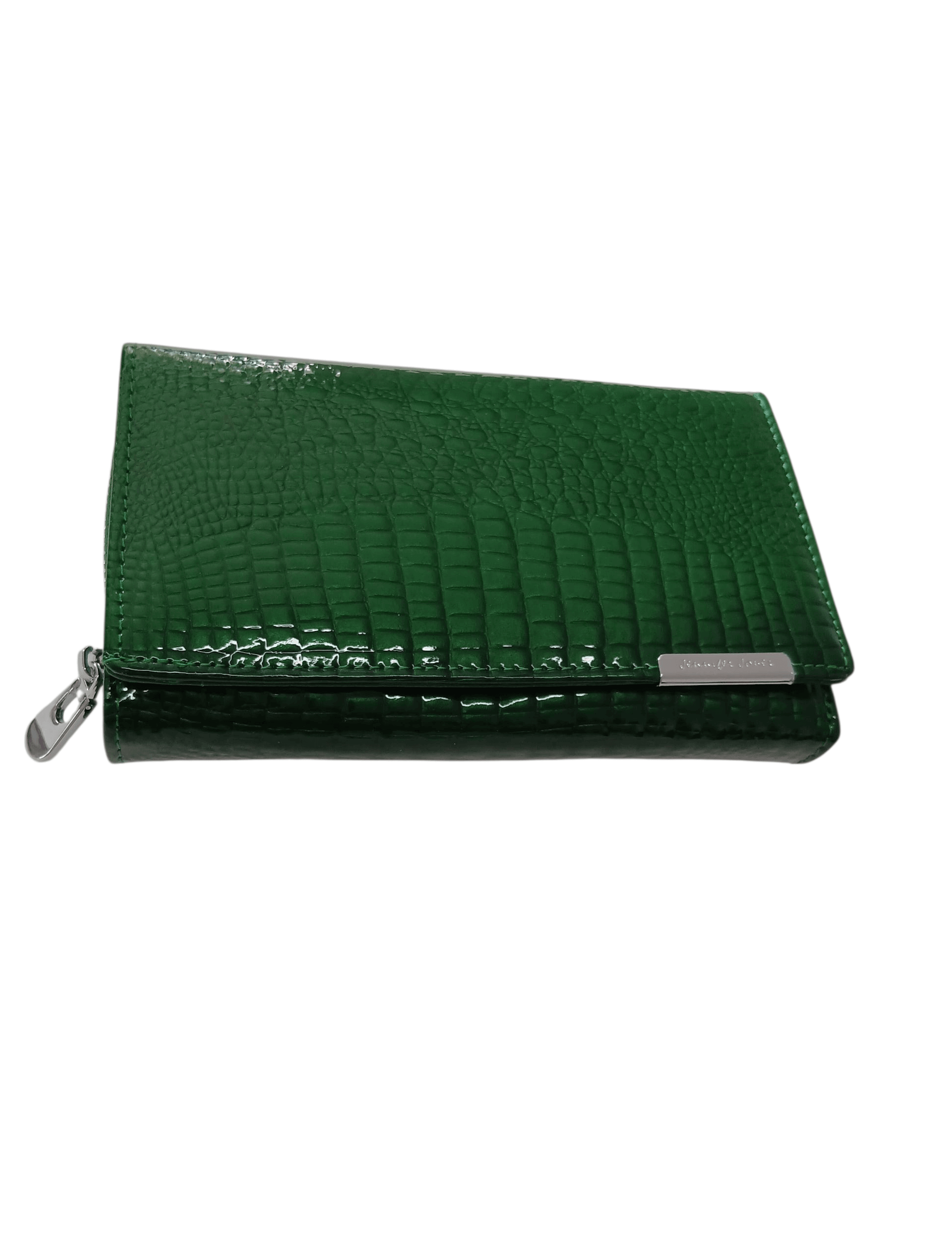Elegancki portfel damski Jennifer Jones– lakierowana skóra, zielony, średni rozmiar, z ochroną RFID 🌿