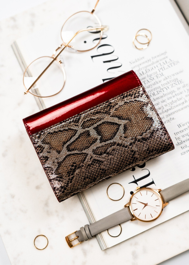 • Czarny korpus portfela ozdobiono wzorem inspirowanym skórą węża – nowoczesnym i wyrazistym.