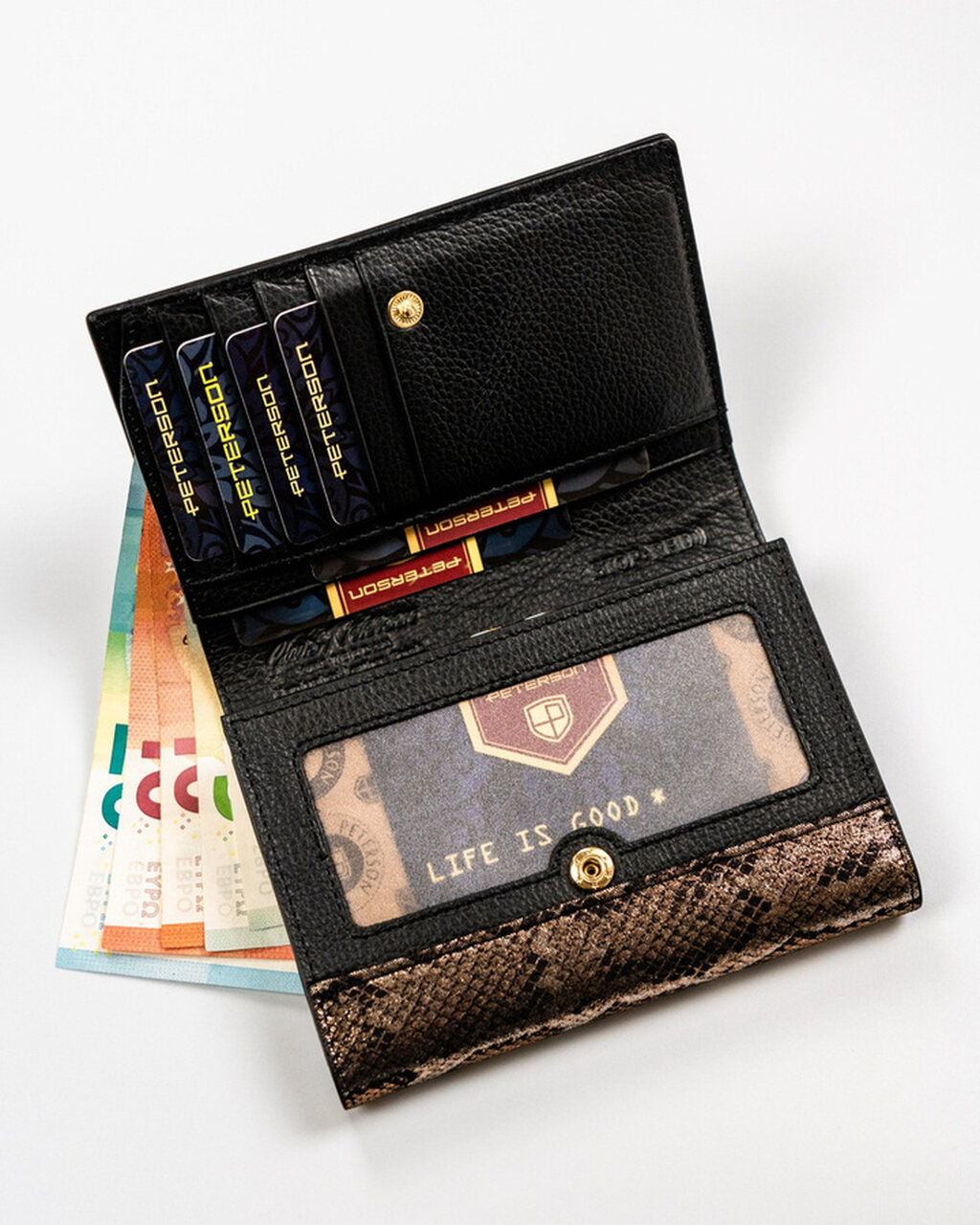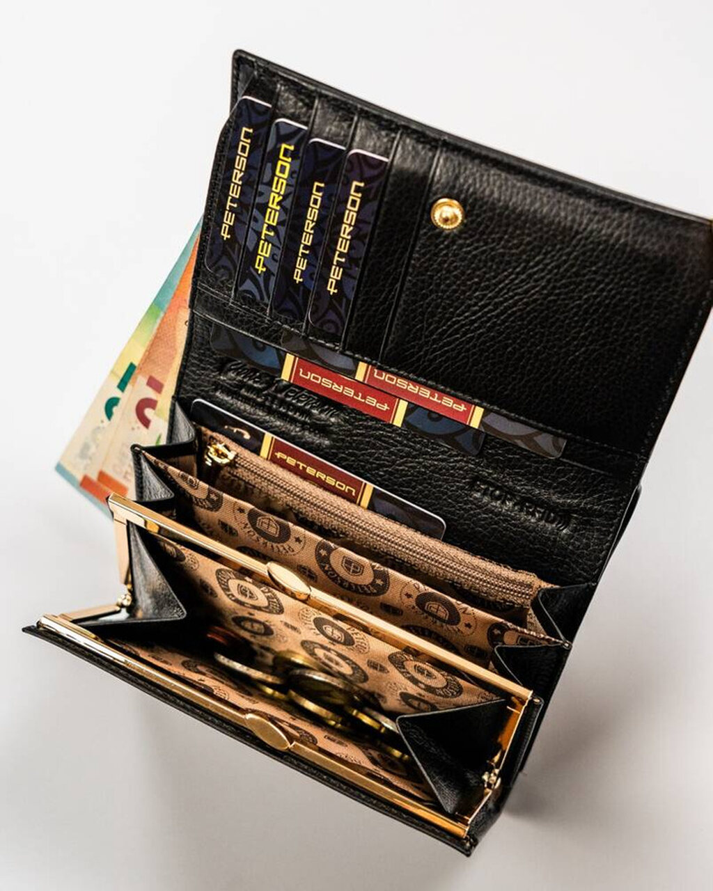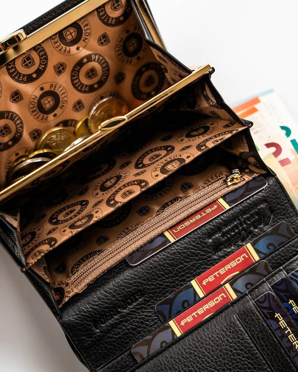• Podwójna kieszeń na monety zamykana na elegancki, złoty bigiel – monety są zawsze zabezpieczone i uporządkowane.