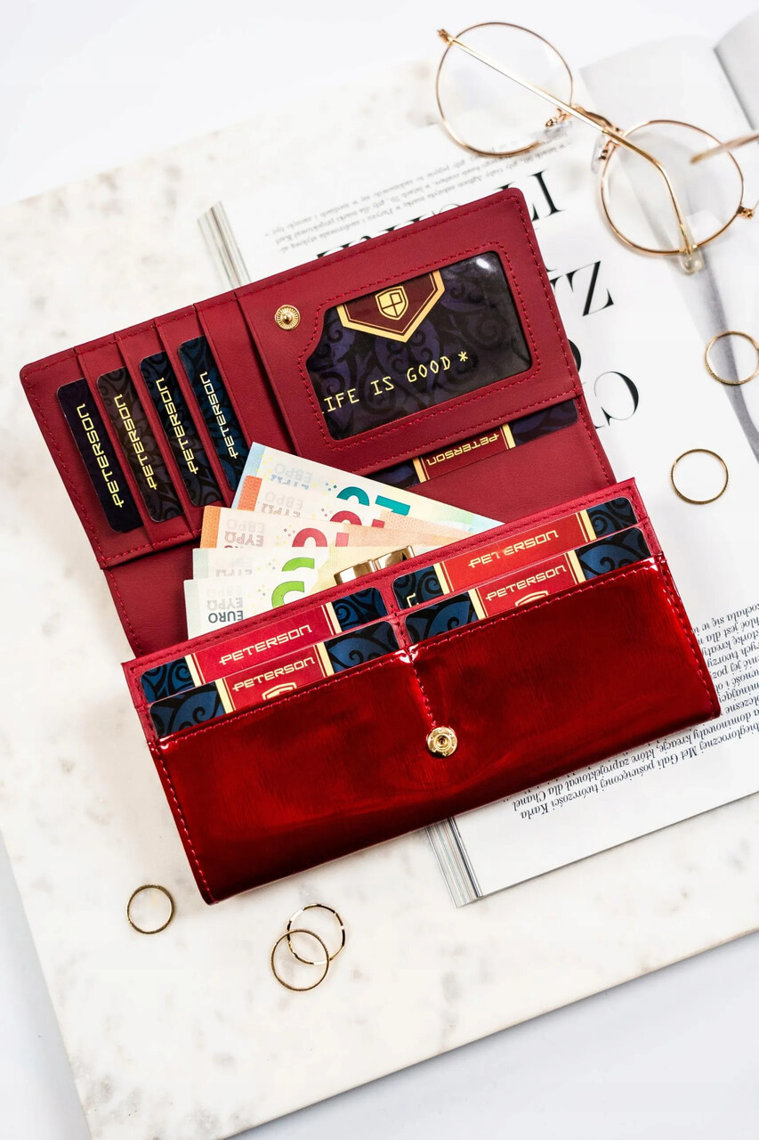 Głęboka czerwień, nowoczesne czarne logo Peterson® i złote okucia sprawiają, że portfel prezentuje się wyjątkowo szykownie. To dodatek, który doda klasy każdej stylizacji – od codziennej po wieczorową.