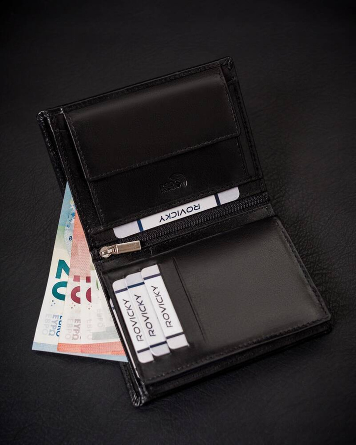 Szukasz portfela, który połączy ponadczasowy styl, trwałość i świetną organizację wnętrza? Ten model Rovicky spełni oczekiwania nawet najbardziej wymagających użytkowników. Wykonany z naturalnej skóry, oferuje dużą pojemność i jednocześnie zachowuje smukłą linię, dzięki czemu wygodnie mieści się w kieszeni.