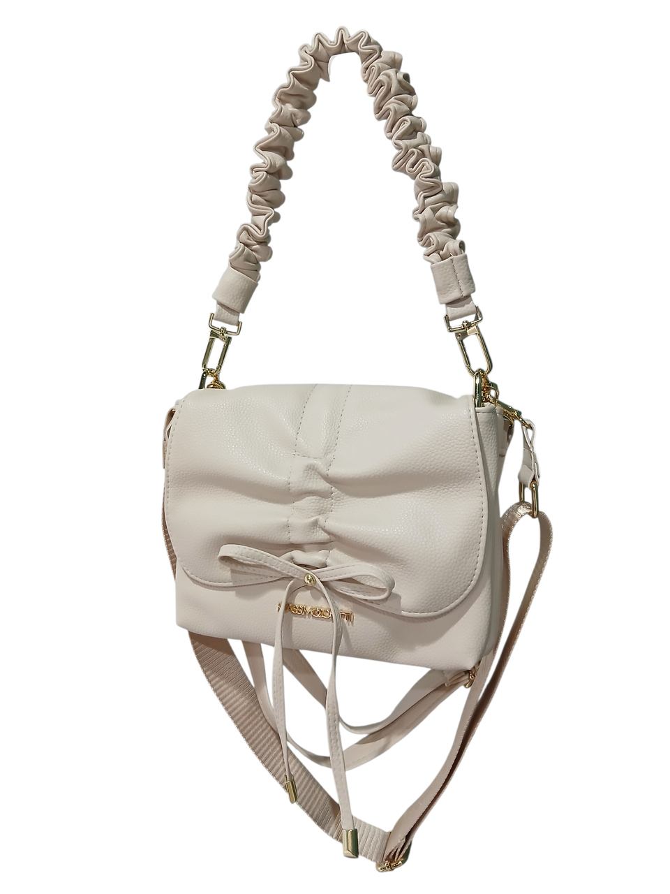 • Materiał i wygląd: miękka ekoskóra z efektownym marszczeniem oraz dekoracyjną kokardą
