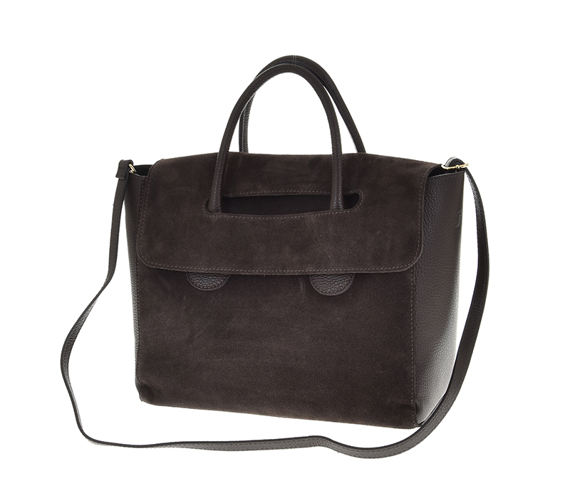 Torebka wykonana jest z połączenia skóry licowej i zamszowej – miękkiej, a jednocześnie odpornej na codzienne użytkowanie.