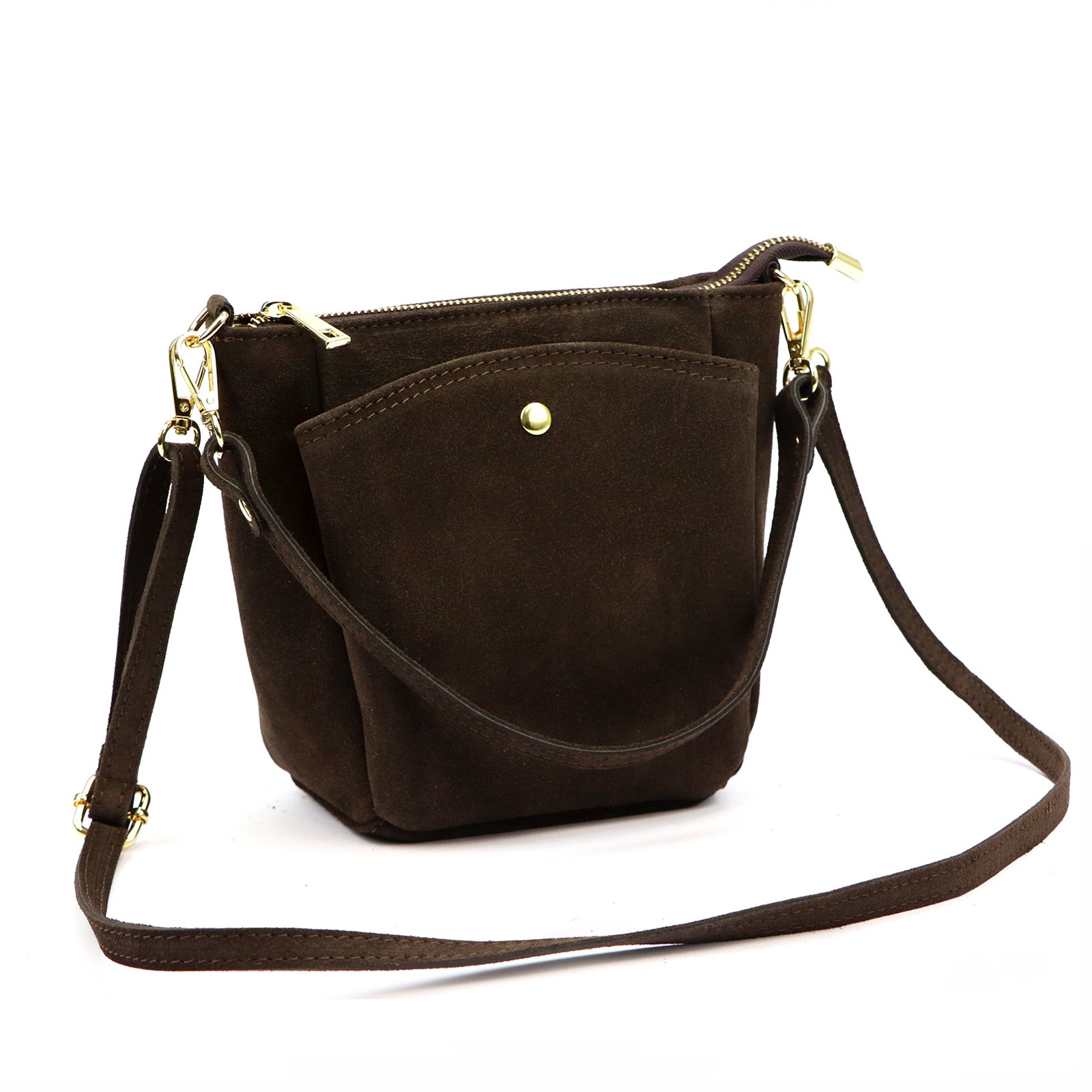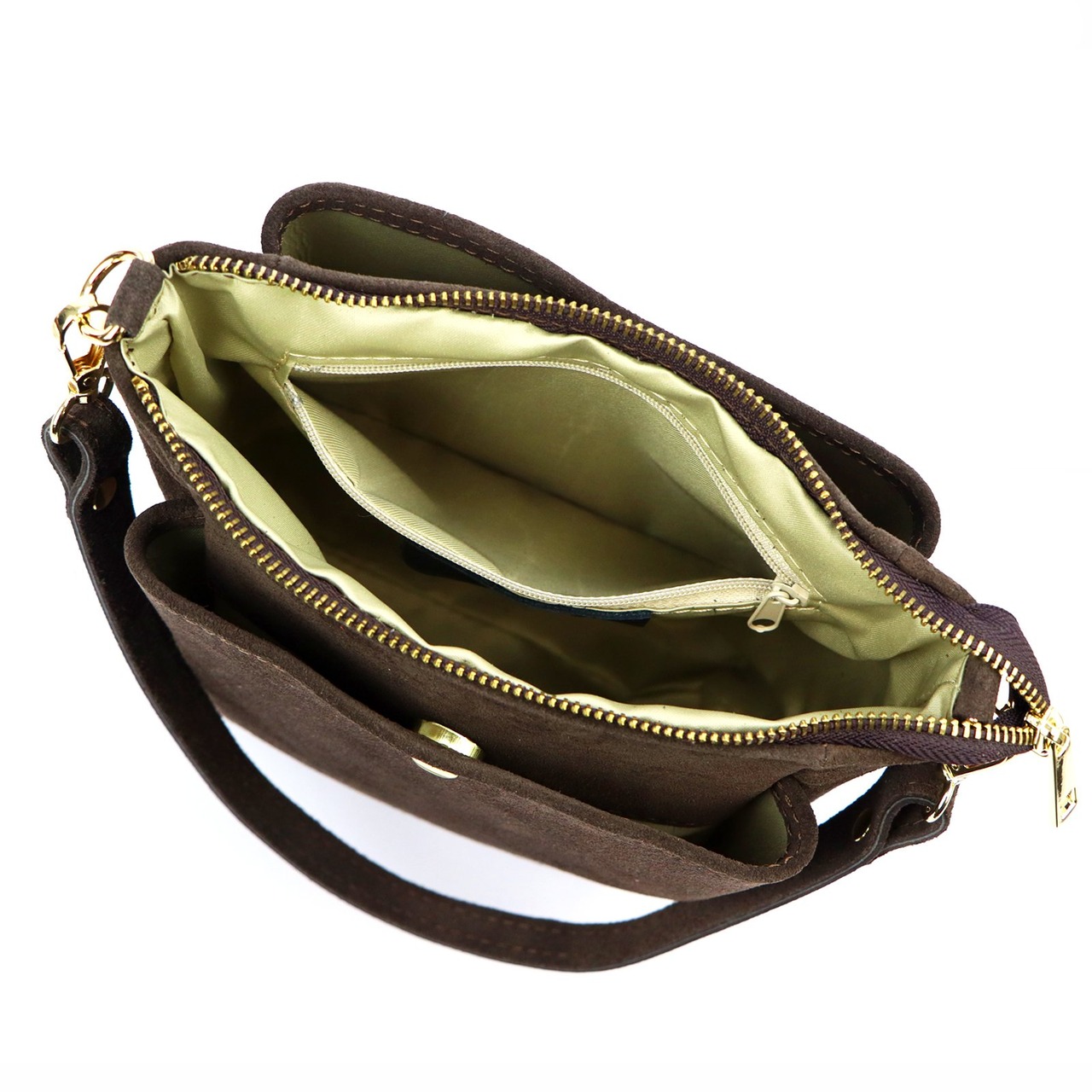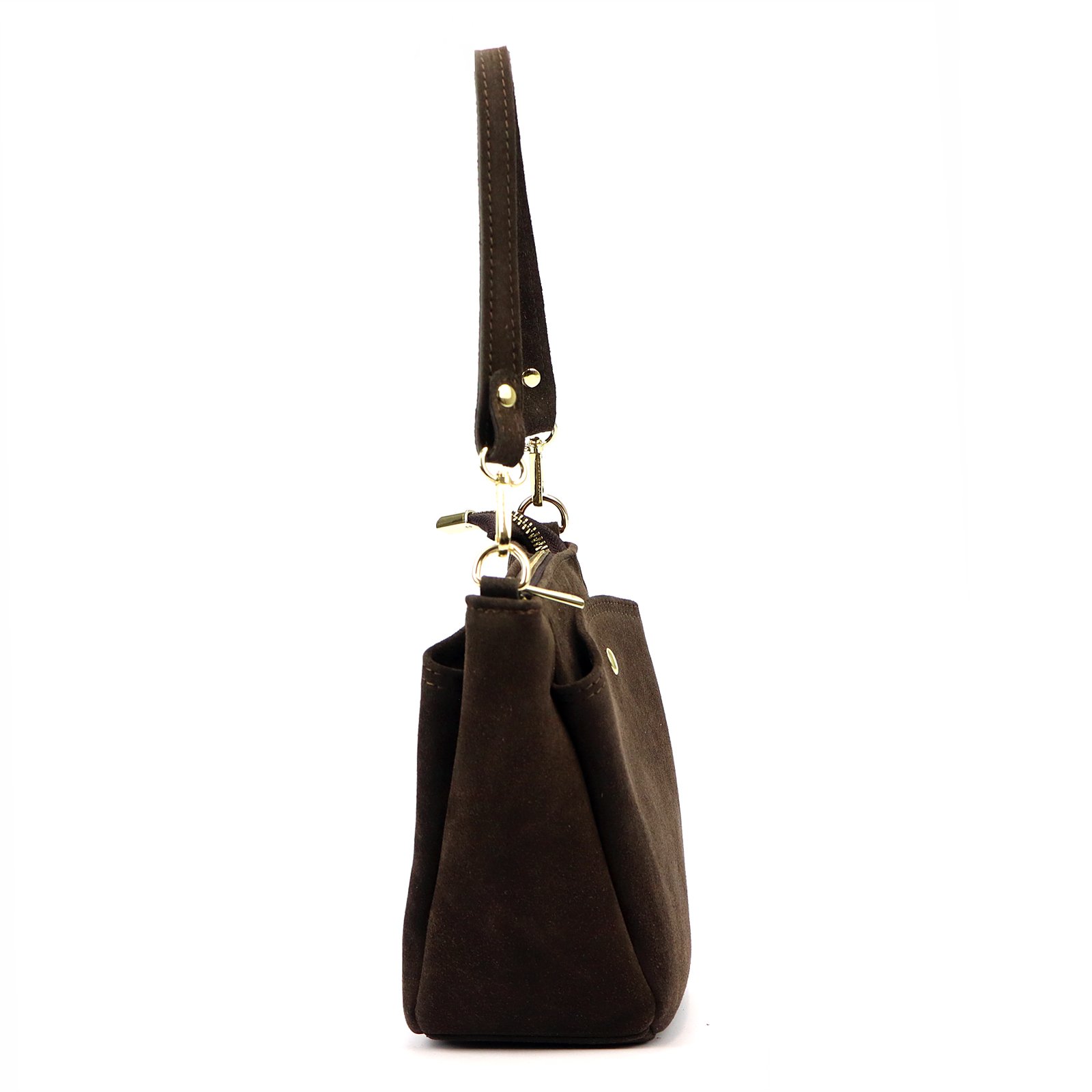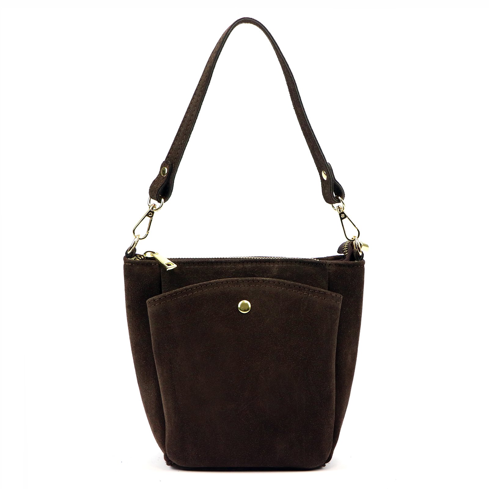 Torebka została wykonana z miękkiej, trwałej skóry naturalnej w odcieniu ciemnego brązu. Materiał pięknie się starzeje, zyskując charakter, a jednocześnie jest odporny na codzienne użytkowanie.
