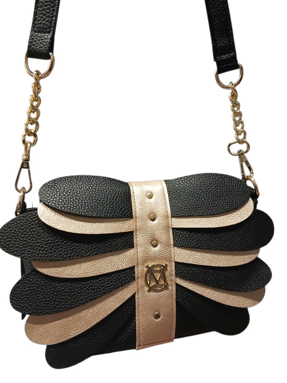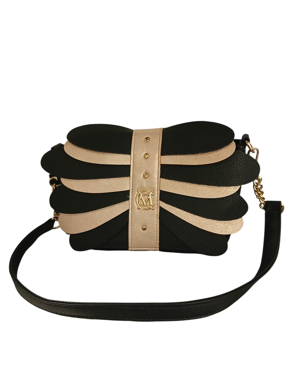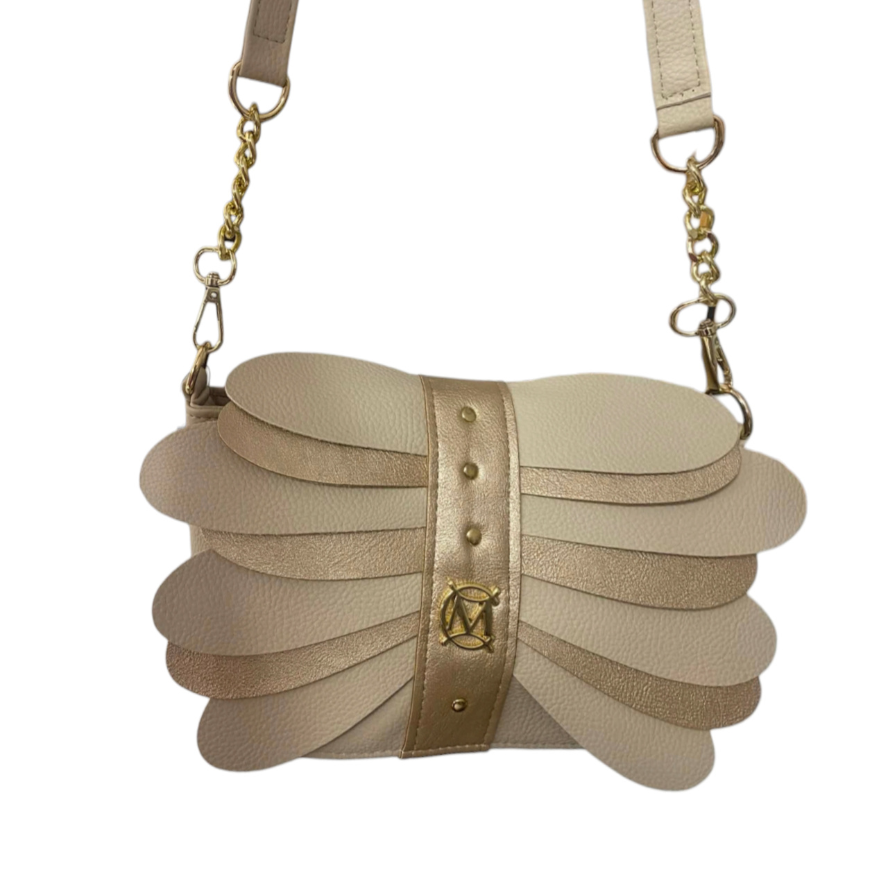 Całość dopełnia centralny beżowy panel ozdobiony złotymi nitami oraz subtelnym, biżuteryjnym logo marki, które nadaje torebce ekskluzywnego charakteru.