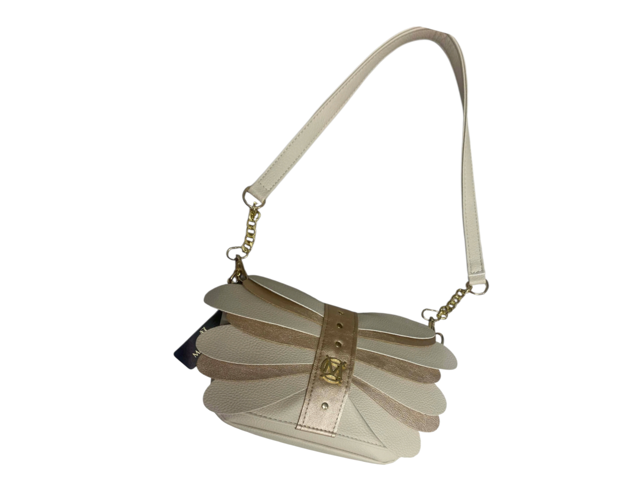 Stylowa listonoszka marki Massimo Contti to propozycja dla kobiet ceniących oryginalne wzornictwo i elegancję. Przód torebki zdobią dekoracyjne, warstwowe aplikacje inspirowane kształtem płatków, wykonane z połączenia groszkowanej, matowej skóry ekologicznej w odcieniach beżu i złota.